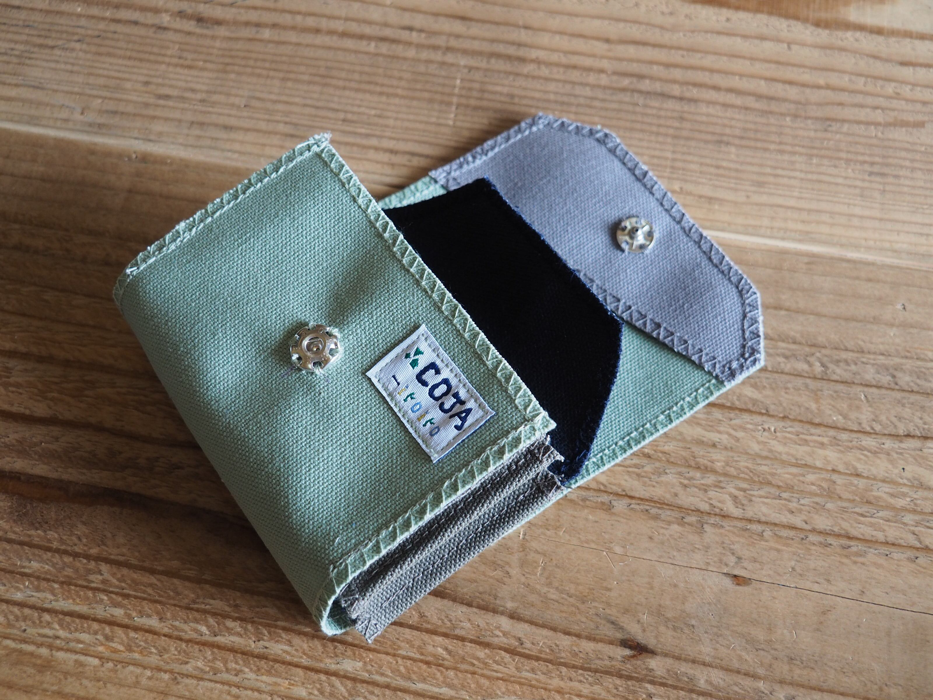 こちらは倉敷帆布の8号帆布を使い、スモーキーセラドンをベースに4色組合わせて作成したお札を折らずに差し込めるジャバラ財布です。