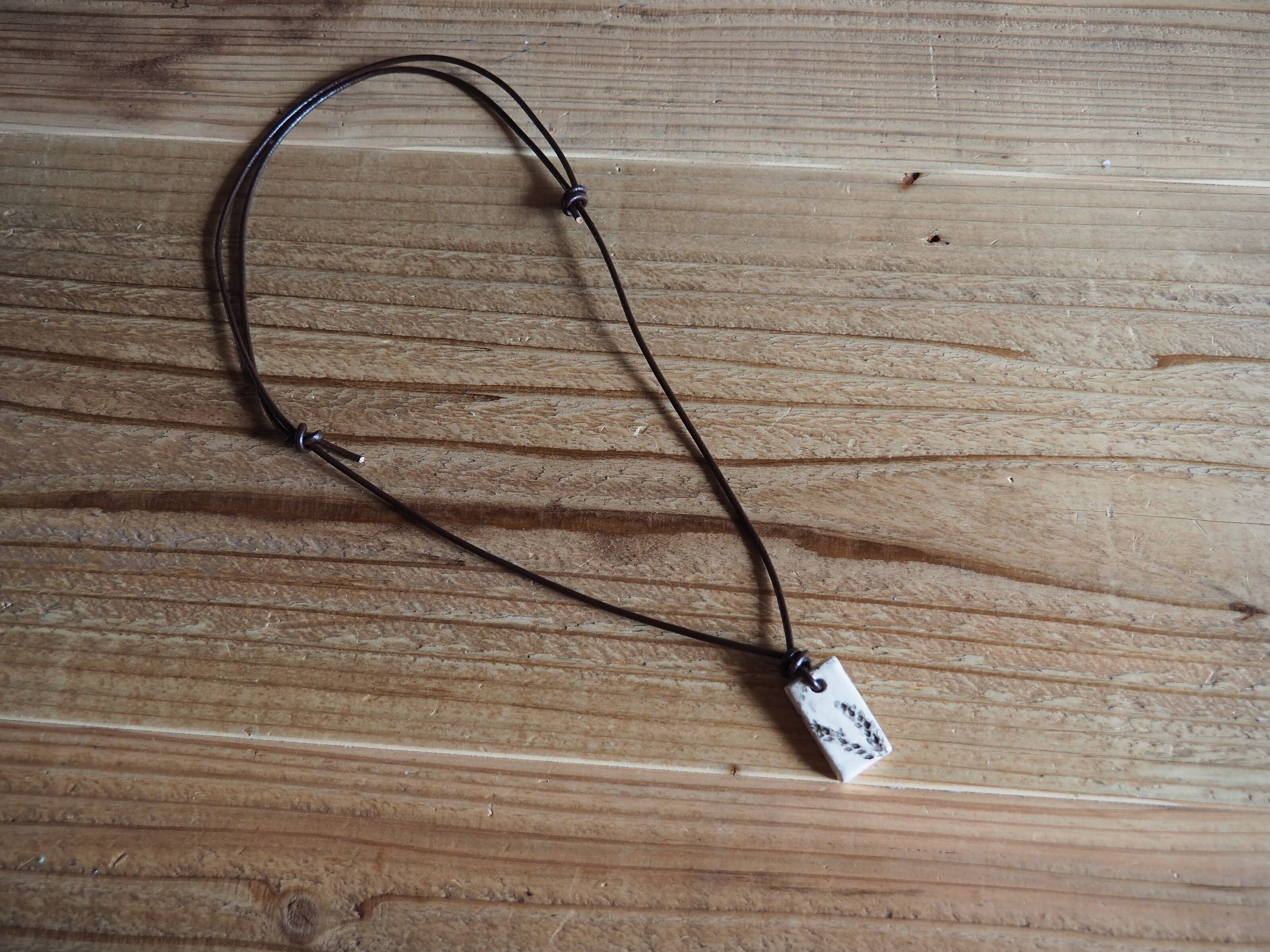 陶器風のペンダントトップに本革の丸紐がマッチし、カジュアルにもシックにもぴったりです。