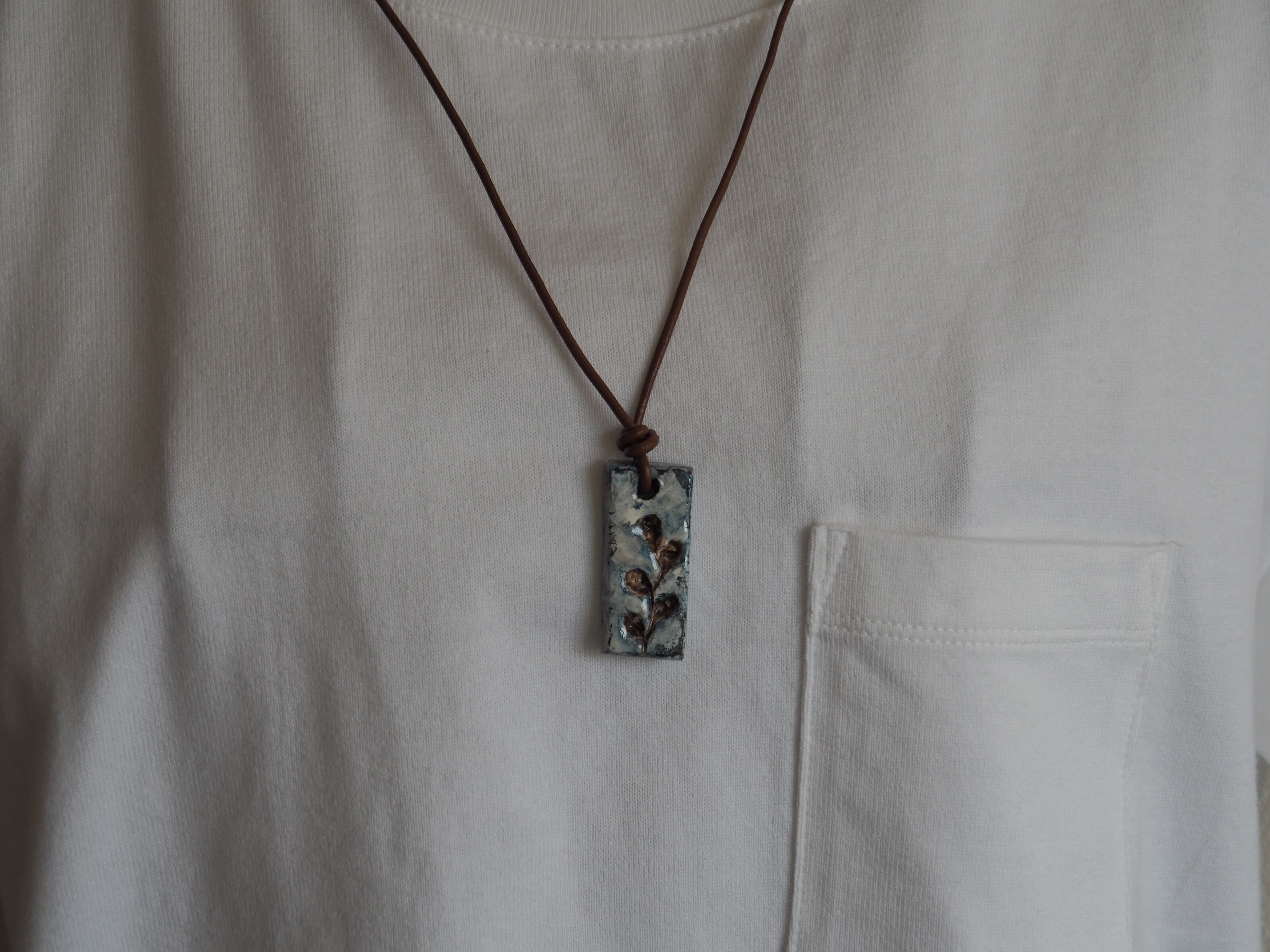 陶器風のペンダントトップに本革の丸紐がマッチし、カジュアルにもシックにもぴったりです。