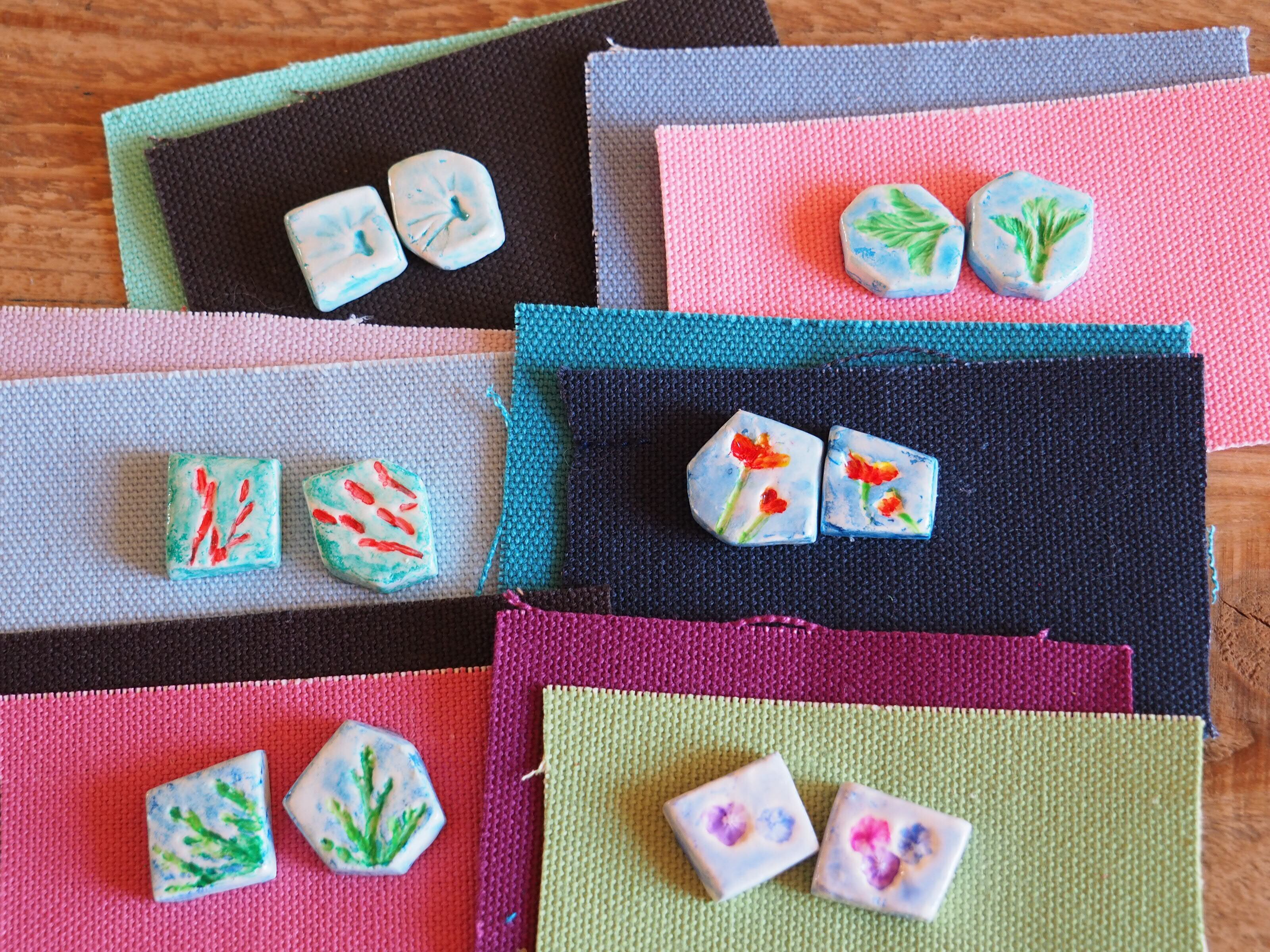 石塑粘土を使って植物で型を取り形成し、十分に乾燥させてからやすり掛けをしてニスを塗り、乾燥後に色付けをし、最後にニスでコーティングいたしました。