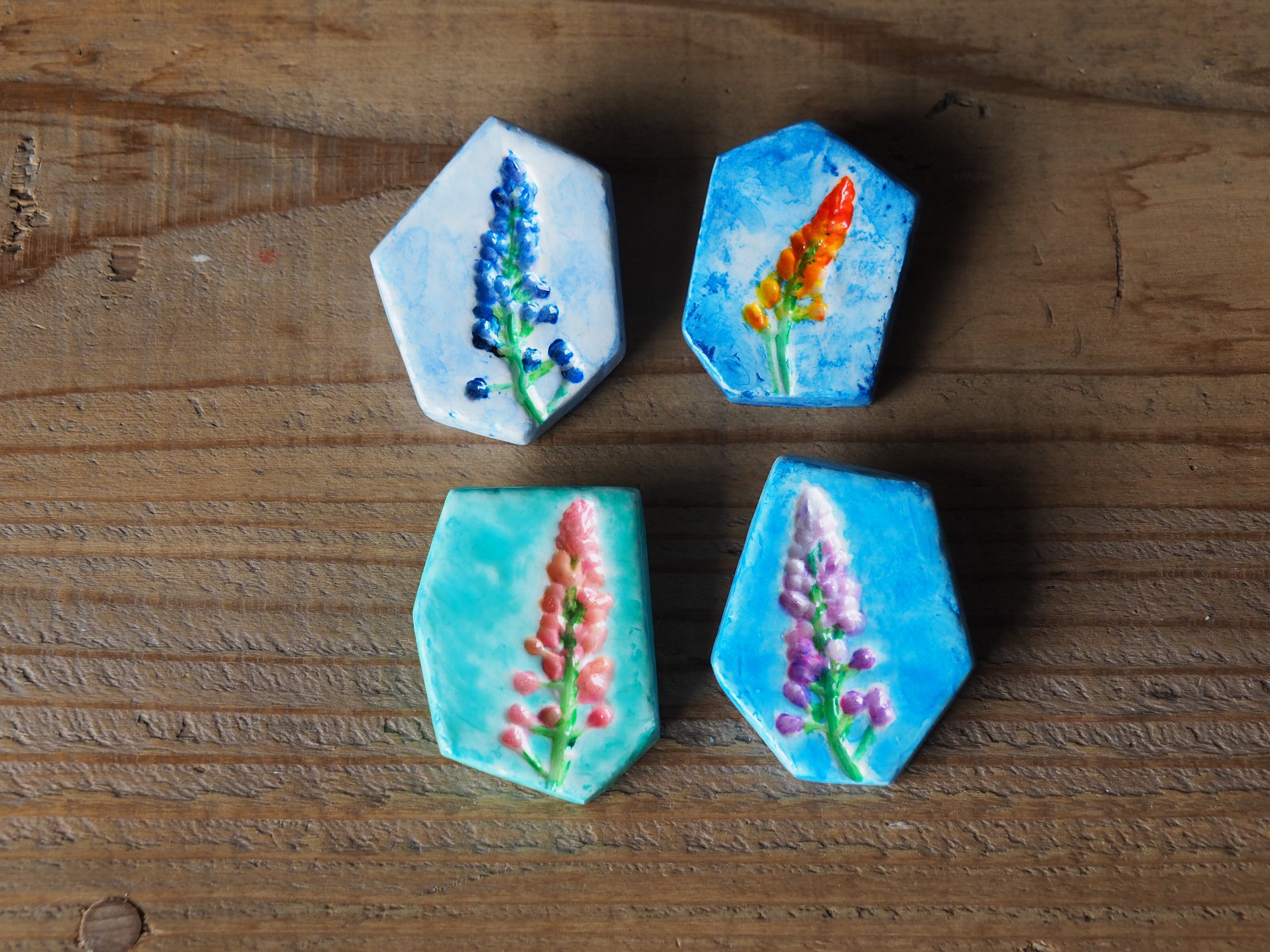 石塑粘土を使って植物で型を取り形成し、十分に乾燥させてからやすり掛けをしてニスを塗り、乾燥後に色付けをし、最後にニスで何度かコーティングいたしました。