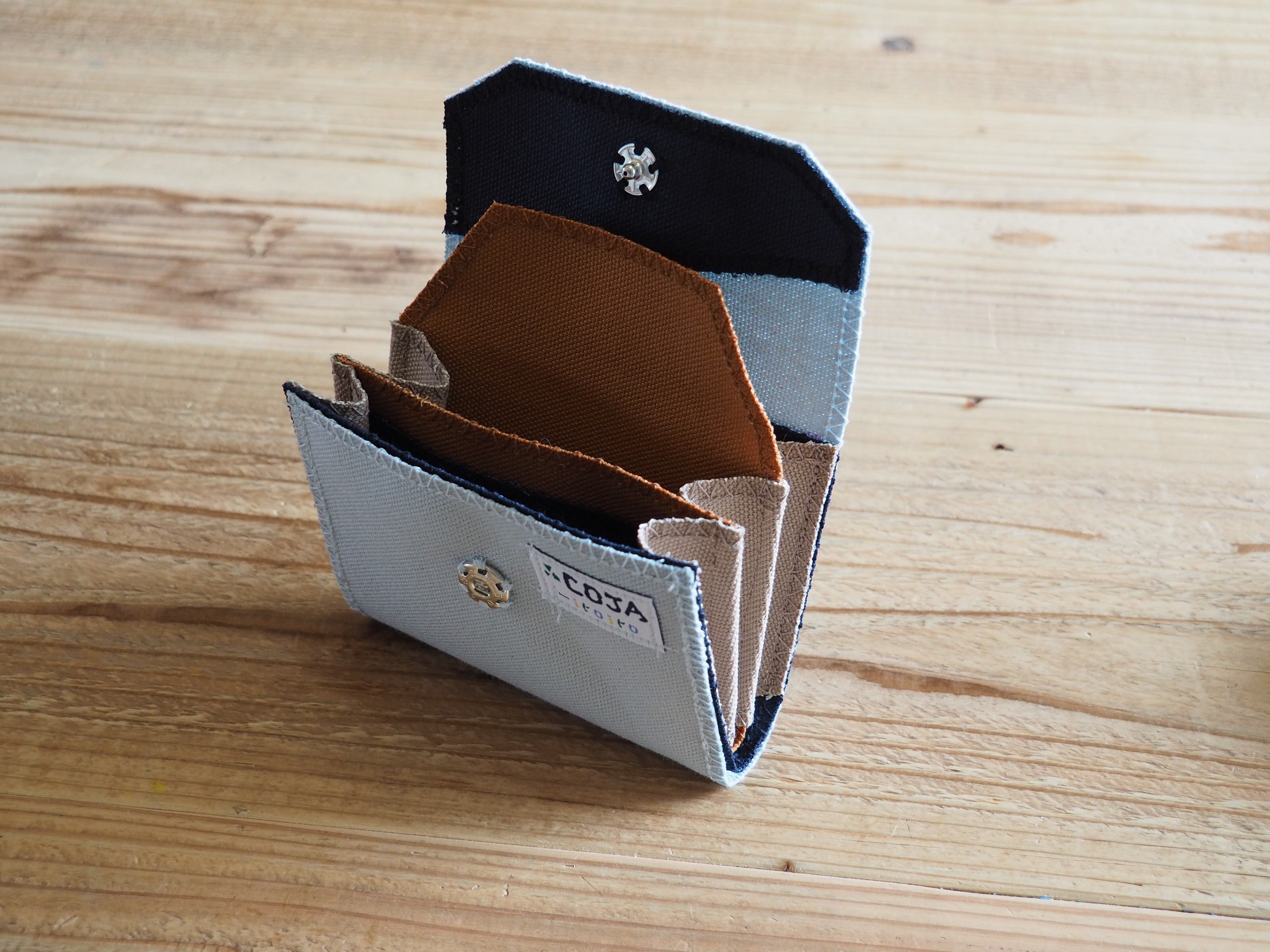 こちらは倉敷帆布の8号帆布を使い、ベビーブルーをベースに4色組合わせて作成したお札を折らずに差し込めるジャバラ財布です。