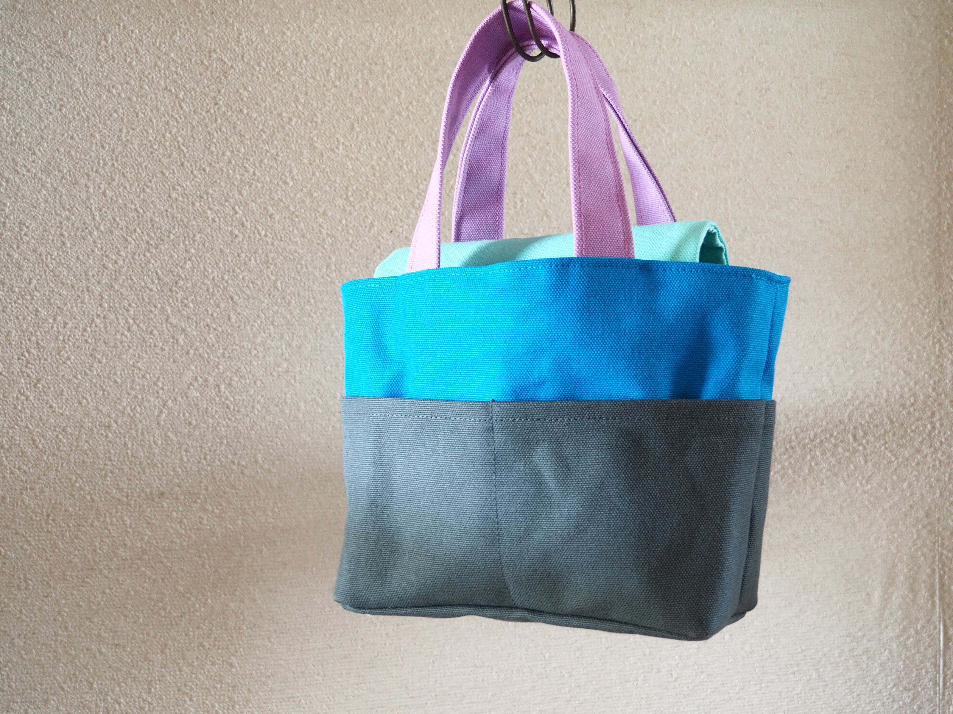国産の倉敷帆布の8号帆布を使い、スカイをベースに4色を組み合わせて作成した、ポケットが沢山な蓋つきトートバッグです。